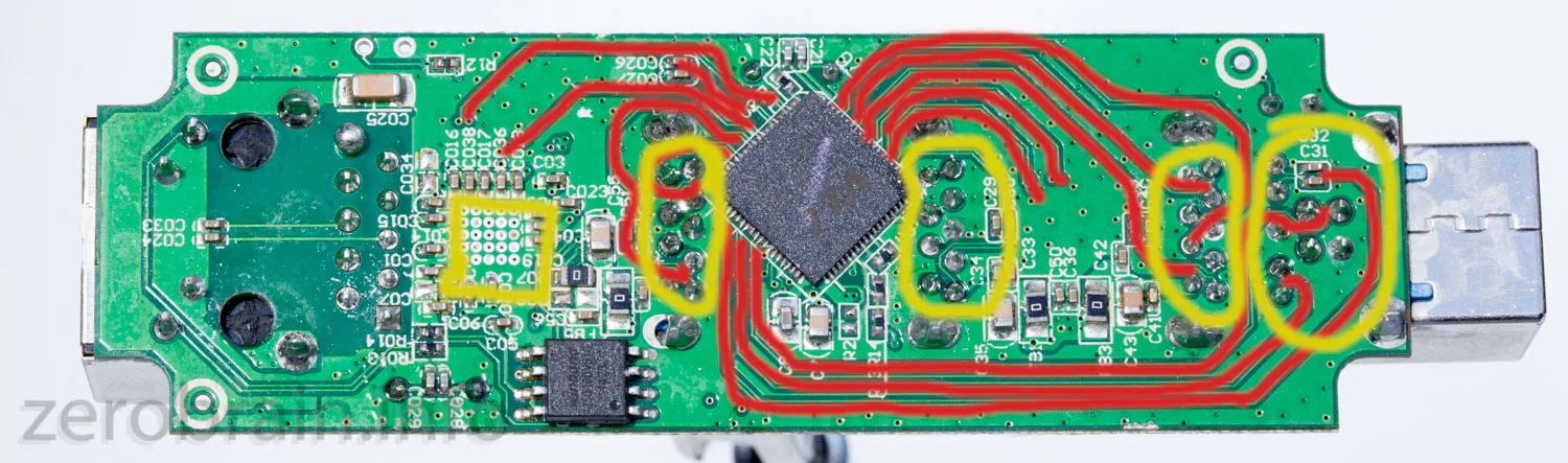Malen nach Zahlen: die USB 3 Doppelleitungen nachgezeichnet (rot) und die USB Geräte (gelb).