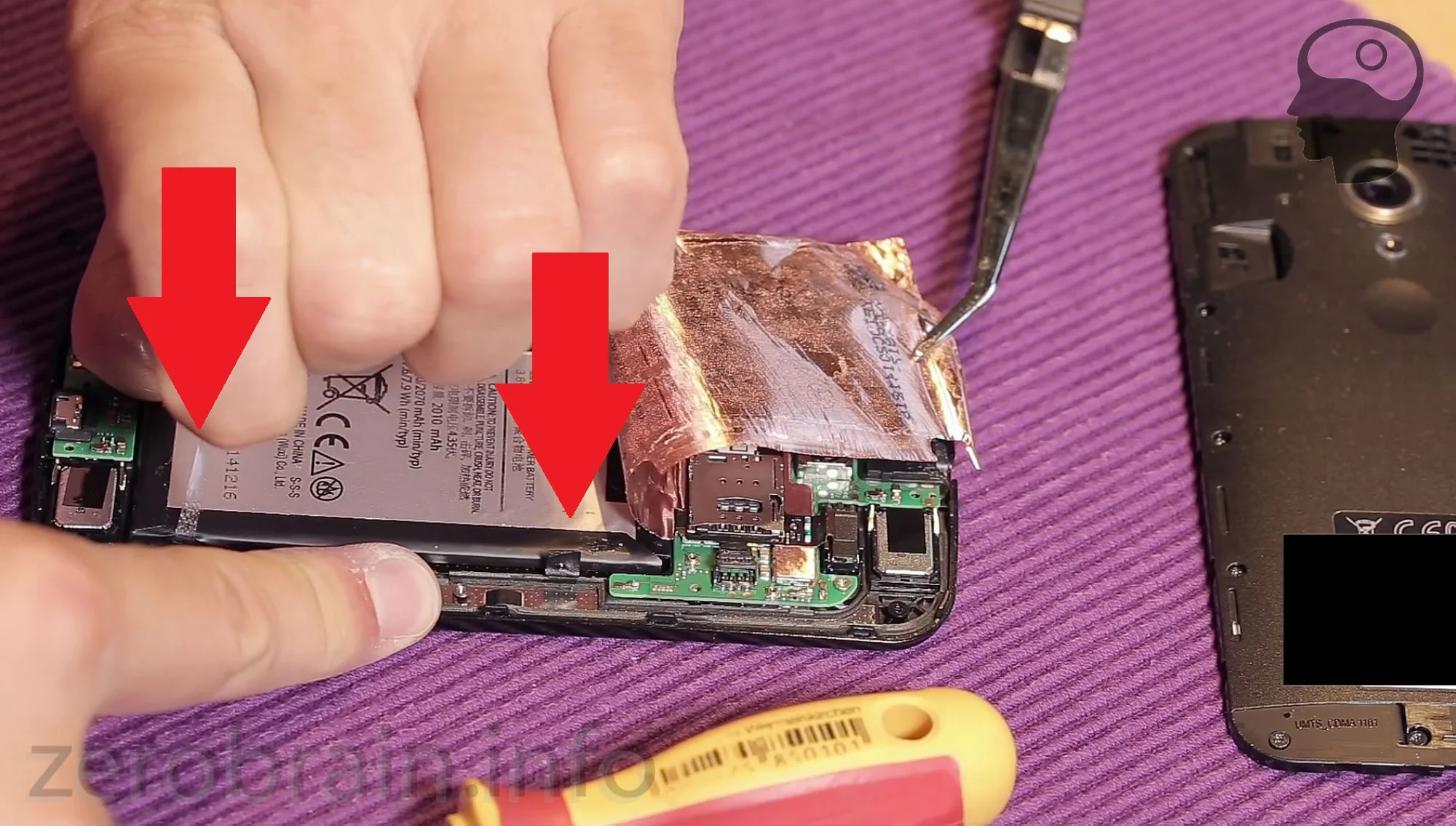 Schritt 6: neuen Akku mit der Klebefolie versehen und in umgekehrter Reihenfolge wieder unter dem Kartenslot das Kabel durchführen.