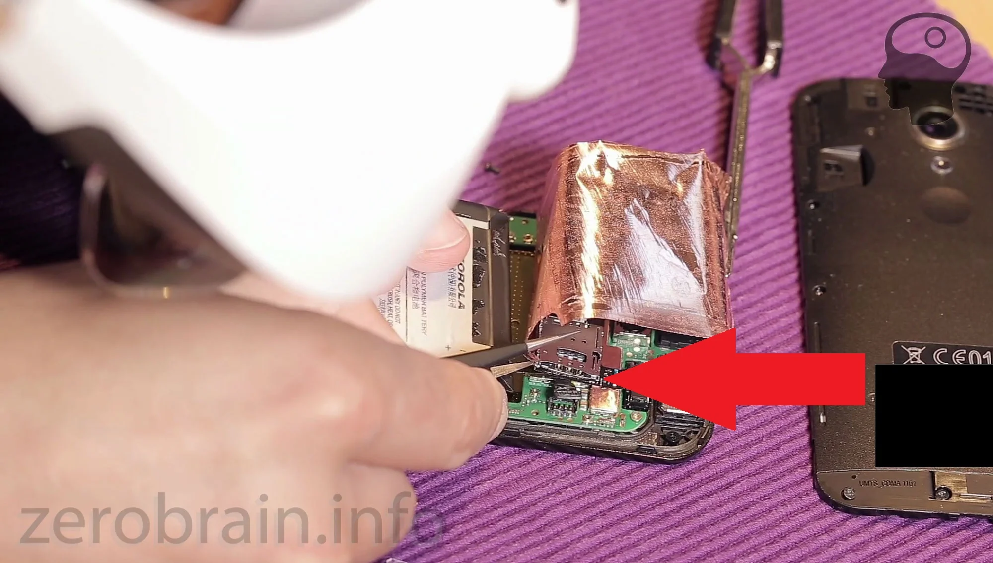 Schritt 2: Vorsichtig mit einer Pinzette die Kupferfolie abziehen und fixieren (Achtung - keine Kurzschlüsse fabrizieren)